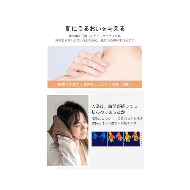 超微細泡&「泡力」洗浄力: 水を超微細な泡に変えることで、最大12億9800万個のバブルを生成。通常の水に比べて優れた洗浄力を発揮し、皮膚の汚れを効果的に取り除きます。これにより、つややかな肌を実現します。