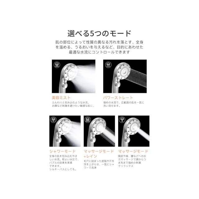 商品名:シャワーヘッド マイクロナノバブル 【2025新モデル・節水・塩素除去】 節水 高洗浄力 手元止水 しゃわーへっど 毛穴 ケア 汚れ 除去 美肌 保湿 ミスト マイクロバブル 超微細泡 シャワーヘッド シャワー フバブル 5段階モード (塩素除去, ミラーシルバー)