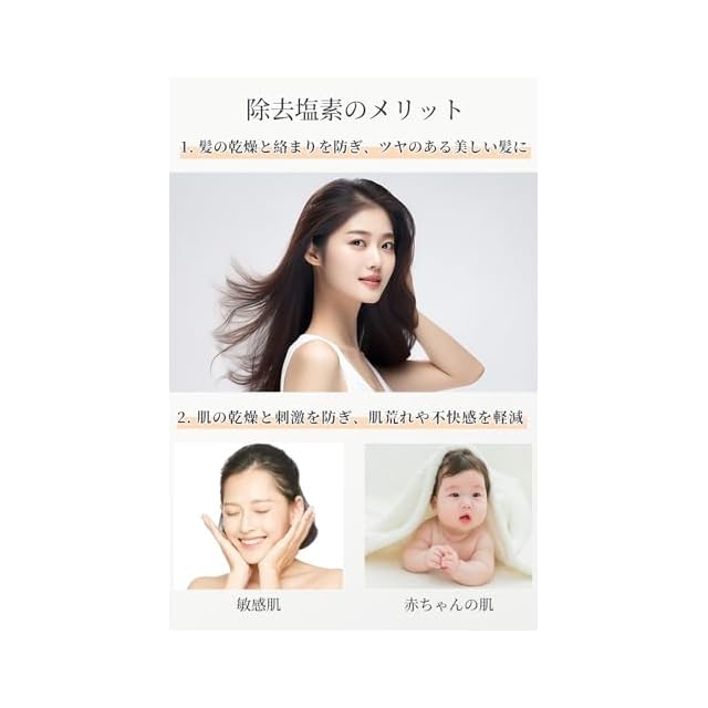 塩素除去機能を新たに追加し、シャワー時の水質を改善します。水道水に含まれる塩素を効率よく除去することで、肌や髪への刺激を軽減し、より健康的なシャワータイムを提供します。塩素が肌や髪に与えるダメージを抑えることで、しっとりとした肌触りと艶やかな髪の質感を実現します。また、内蔵された高性能フィルターが水を浄化し、快適でリラックスできる時間をお楽しみいただけます。