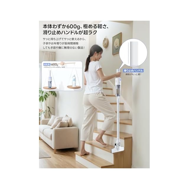 ✨【超軽量・スリムボディ】最も軽いコードレス・スリムクリーナー掃除機が登場です!スティックタイプ使用時で約850g、ハンディタイプ使用時で約600gという圧倒的な軽さを提供します。人間工学に基づいたハンドルで片手操作も楽に、上下90度、左右180度の自在な可動式ヘッドに、高所や家具の下まで、自由にアクセスできて、小さなお子さんでも使えるほどの驚きの軽さです。【限定期間キャンペーン】今ご注文いただくと、交換用フィルター/ネットフィルターがもらえる!(お一人様1回)お気軽に説明書の連絡先より弊社までご応募してください!