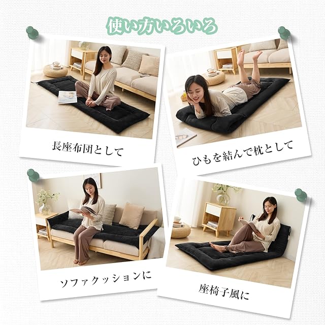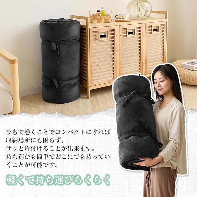 【多様な用途】ふんわりと心地いいやわらかさでリラックスタイムにぴったり。座布団として使えば2人以上が座れるので来客時にもおすすめです。ソファの上に乗せてソファクッションとしても使えます。小さく折り返して紐を留めれば枕代わりになります。肌触りが心地よい眠りに誘います。壁にくっつけて座椅子風クッションとして。読書タイムなど、サッと広げて簡単に使えます。車内使いにも便利です。【軽くて持ち運びらくらく】丸めて紐で結べば、お部屋の隅やタンス横、クローゼットにも!省スペースに収納が可能です。持ち運びも簡単でどこにでも持っていくことが可能です。