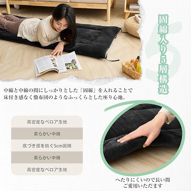 商品名:Housecover ごろ寝マット 長座布団 お昼寝マット 70×180cm ごろ寝布団 ごろ寝クッション 柔らかな肌触り 固綿入り 三層構造 ソファパッド ごろ寝敷布団 フロアクッション 車中泊 長方形 抗菌 防臭 防ダニ 昼寝 コンパクト 一人暮らし シンプル ブラック