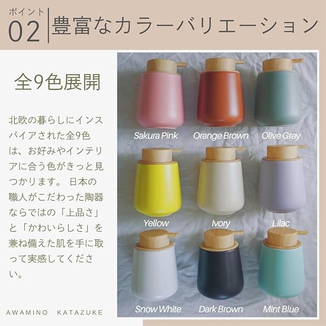 泡ソープ専用の美濃焼ディスペンサー「泡mino」です。 忙しい日常の中、「手洗いの時間を少しでも豊かで心地よいものにできたら・・・」 そんな想いから、このソープディスペンサーは生まれました。陶器ボトル部分の製造を担う窯元は、世界3大デザイン賞のIFデザイン賞を受賞した岐阜県多治見市のKYOTOHです。陶器の肌はグロス(艶)とマット(艶消し)の中間、セミマットに仕上げており、上品な質感となっております。そして、大型ポンプを木目調に仕上げる事で、製品全体を北欧テイストのデザインに仕上げております。また、木製コースターがセットになっており、設置面を傷付けない配慮と共に、インテリアとしての価値をぐっと引き上げます。 ソープディスペンサーを変えるだけでインテリアの魅力が増して、あなただけの素敵な空間を作ることができます。シンプルなデザインなので、ご自宅でのご使用はもちろん、商業施設やホテル、ヘアサロン等で活躍すること間違いなしです。9色の豊富なカラーバリエーションで、お店やお部屋の印象にピッタリの色を選べて、自然に組み入れることができます。