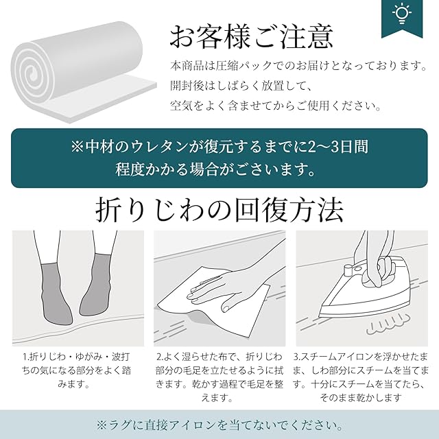 【抗菌防臭・安全安心】ラグには抗菌・防臭・防ダニ加工が施されており、清潔な状態を長く保ちます。小さなお子様やペットがいるご家庭でも安心してご利用いただけます。アレルギーが気になる方も安心してご利用いただけます。
