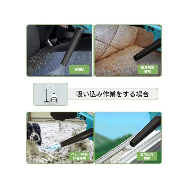 ▶▶【一台二役】 吹き飛ばし・強力吸塵機能付きの1台2役の充電式ブロワーです。ノズルの差込場所を変更すれば、落葉掃除、車の掃除、 洗車、ケースのほこり、庭の掃除、工業掃除、家庭の掃除、コンピュータやその他の電気製品に蓄積されたほこり、布団、壁の隅、死角、ベッドの底、カーペット、ペットの毛、家具、毛髪のゴミなどを簡単に吸い取ります。様々なシーンで活躍できます。マキタ ブロワーに負けない高品質のブロワーです!