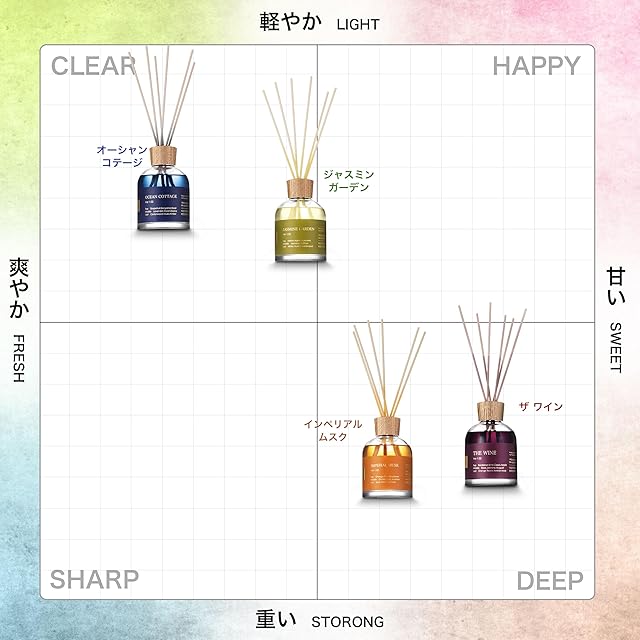 【使用方法】付属のスティックを3本、ボトルに挿してご使用ください。スティックが液体を吸収し始めると、自然に香りが広がります。香りの強さは、スティックの本数を増減させることで調整が可能です。