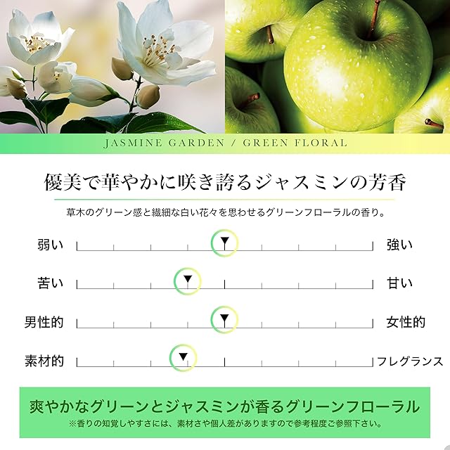 【軽やかで気品に満ち溢れるジャスミン】ジャスミンを主体とした、香り高い花々に囲まれたガーデンを彷彿させるグリーンフローラルノート。瑞々しいアップルの爽やかな果汁が、ジャスミンや白い花々の柔らかさに溶け込み、軽やかで清潔感のある印象を与えます。ホワイトムスクが優しく包み込み、まるで咲き誇る庭園を散策しているような、空間を華やかに彩ります。