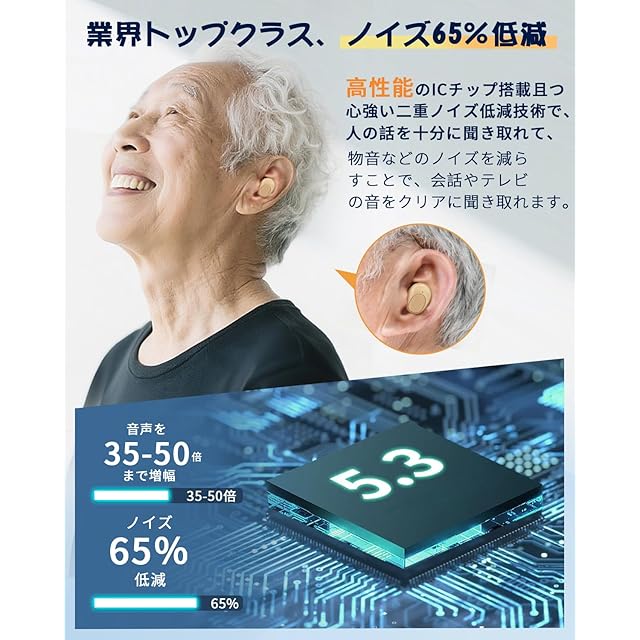 【2025最新進化集音器・操作は非常に簡単!】弊社の革新的の集音器は充電ケースから取り出して本体の指示ランプはオレンジ点灯を表示し、5秒内に自動的に電源入れ、それから耳に置くだけ操作は完了。操作は簡単で、お年寄りや若い方に問題なく使用します。最新技術のiCチップを採用されていて、音量の増幅は最大35-50倍となり、同時に物の音によるノイズは65%低減、人の対話の音やテレビの音はよく聞こえます。軽度から中程度の聴力障害の方に最適です。