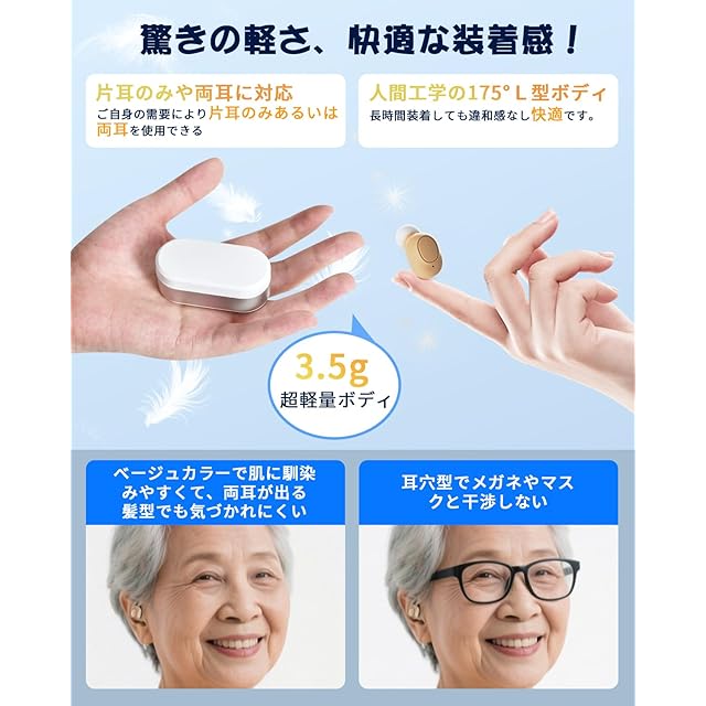 【人間工学設計で疲れにくく、快適な装着感を体験】人間工学に基づいたデザインはファッショナブルで目に見えないため、使用者に心理的な圧力を与えません。集音器本体はコンパクトのL字型で、弧は175°、耳への負担を大幅に軽減し、長時間に装着しても痛みません。初めてご使用の前に、集音器の絶縁保護フィルムをはがし、充電ケースに入れて2〜3時間充電してください。
