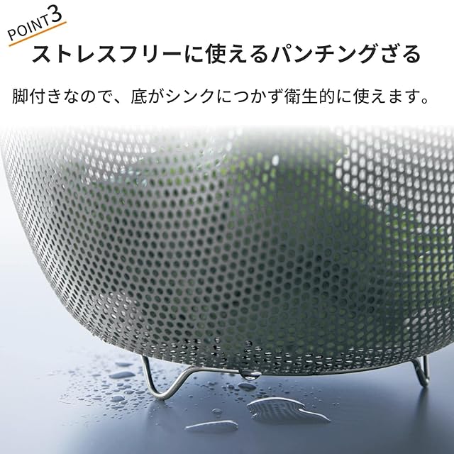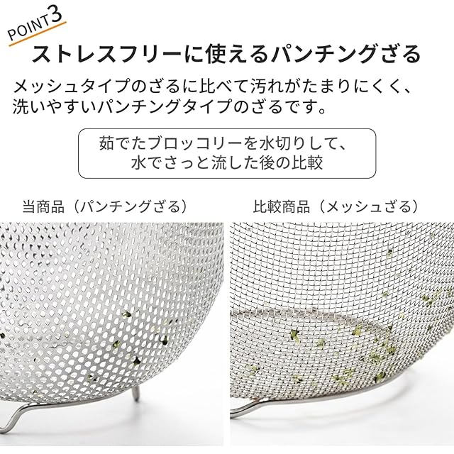 すっきり収納できるステンレスボウル&ザルセット 料理をもっとすきになれる、「一生モノ」のざる・ボウル。厚みのある18-8ステンレス素材を使用し、長く使えるように丈夫につくられています。ボウルを重ねると高さが揃うので収納場所をとりません。ボウルには目盛りがついて軽量カップの代わりとして使用することができます。メッシュタイプのざるに比べてパンチングタイプのざるは、穴詰まりが少なく、洗いやすいのが特徴です。