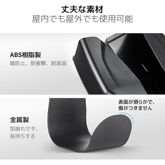 丈夫な素材:他社のプラスチック製フックに比べ、弊社の電気自動車充電ケーブル収納のケーブルを引っ掛ける「J」部分が金属製なので型崩れせず、長持ちする。表面の処理もわざと荒らしたようなマット処理になっていて、高級感を演出する。