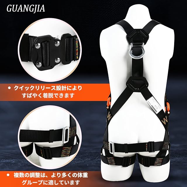【GUANGJIA調整可能なフルハーネス 新規格】:複数の調整は、より多くの体重グループに適しています高所での作業を容易にするためには、適切なフィットが重要です。当社のハーネス安全帯は、ユーザーが重量内で適切にフィットするように 6 点の調整を提供します。ショックアブソーバーはついていますので、一旦落下時墜落時、ハーネスは衝撃を体全体に分散し、人体への負担を軽減します。フルハーネス安全帯 新規格 セットは、安全で快適、着やすく、あらゆる体格の方に適しています。ハーネスが適切にフィットするように、すべてのバックルが接続されていること、レッグ ストラップとショルダー ストラップがぴったりと合っていること、チェスト ストラップが胸部の中央にあることを確認してください。