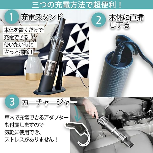 【自由な掃除時間・置くだけ充電】高性能なリチウムイオン電池を採用、標準モードで30分間、パワフルモードで15分間使用可能です。ハンディクリーナー本体を置くだけで充電できるスタンドが付属しています。使いたい時にさっとお掃除ができます。ランプで充電状況と使用切れ時間をお知らせします。(充電中⇒ライトが点滅、充電完了⇒ライトが点灯、充電不足⇒ライトが点滅)カーチャージャーも付属しているため、走行中に繋いでおけば、いざ使いたい時に“電池切れ”ことも防げます。コンセント用のACアダプターも付属しているので、自宅やEV車用でも充電可能です。