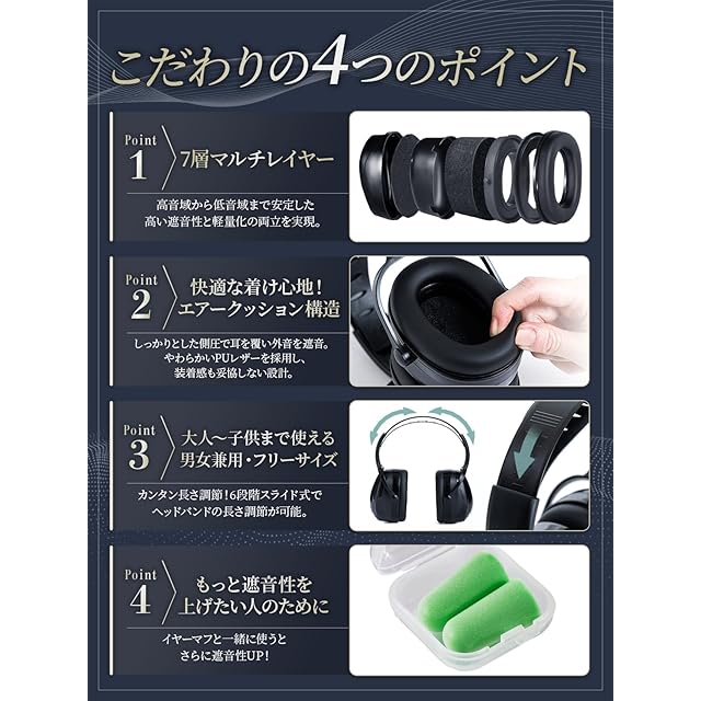✅【7層マルチレイヤーを搭載】遮音効果を高める多層構造により、高音域から低音域までの広い音域をカバー。騒音対策、読書、勉強時の防音など、幅広いシーンに対応したイヤーマフです。