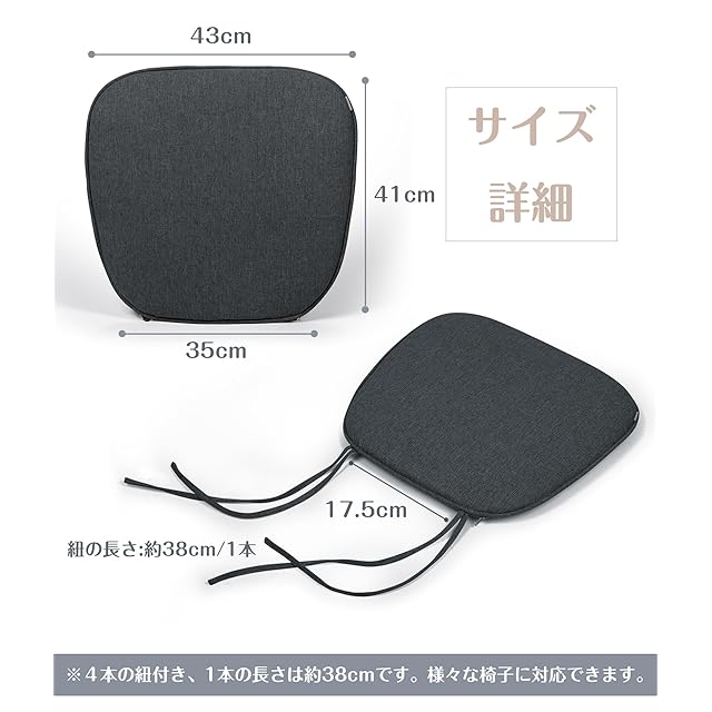 ✅【ダイニング 椅子 クッションの仕様】サイズ:幅43×奥行41cm×厚み3cm チェアクッションは4本の紐付き、紐の長さ:約38cm/1本、紐と紐の間隔:約20cm 本体重量:0.56kg/セット ✿✿✿2枚セットはお得です。