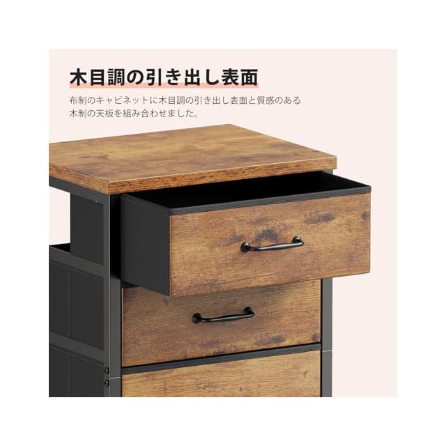 【温かみのあるデザイン】布制のキャビネットに金属のシンプルな取っ手と質感のある木制の天板を組み合わせました。シンプルなデザインと落ち着いた色合いで、単体の使用でも違和感なくインテリアになじみます。オフィスや寝室、リビングなど、さまざまな場所で使用できます。