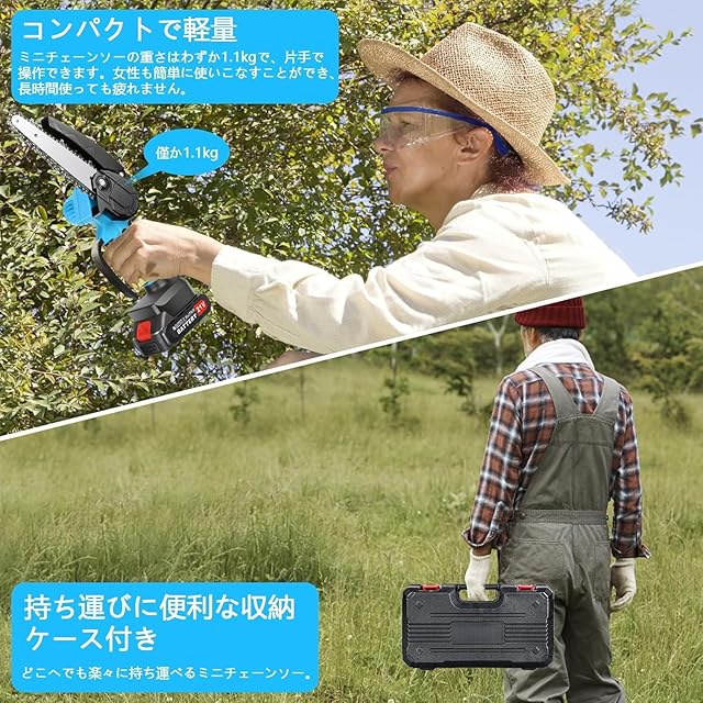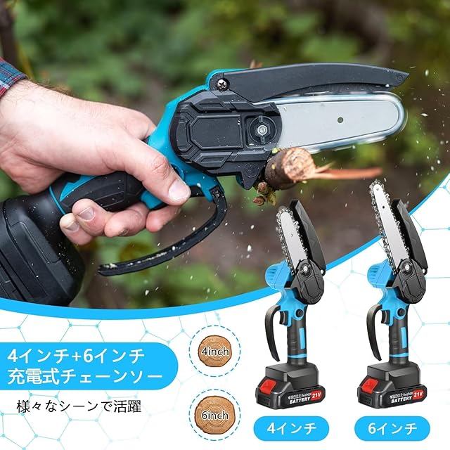 商品名:チェーンソー 充電式 ブラシレスモーター 充電式チェーンソー ハンディチェーンソー 2個搭載 2000mAh 大容量バッテリー 21V 小型チェーンソー 電動ノコギリ ハンドチェーンソー ポータブル ミニ 2セットのガイドバーとチェーン(4インチ+6インチ) PSE認証済み