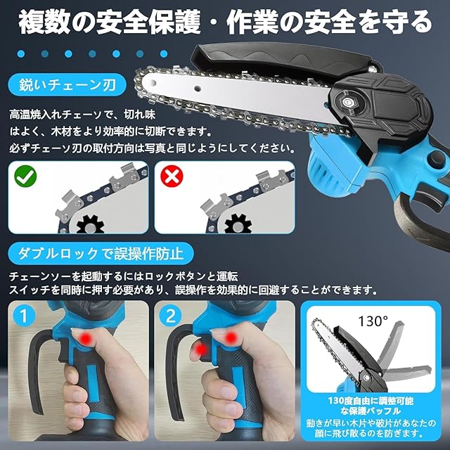 他に類を見ない性能と耐久性を体感ください: 550W純銅モーター搭載の電動バッテリー式ミニチェーンソーは、長寿命、高トルク、ハイパワーを実現し、摩耗を軽減。高品質ガイドバー採用で、スムーズで長持ちする切断が可能です。内蔵回路が過負荷を防ぎ、過熱時には自動停止機能で安全性を確保します。
