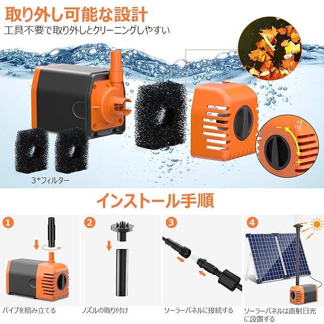 【強力なソーラーポンプ】ソーラーポンプは水位と流量を調節することができます。ポンプにはフィルターカバーと3枚フィルターがあり、汚れを除去してクリーニングしやすいです。最大流量は480 GPHで、最大昇降高度は約2.6メートルに達することができます。
