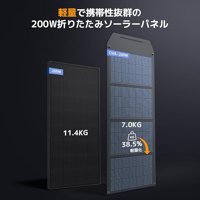 DC23.6V/47.2V可変電圧仕様:CSUL-200W 折りたたみ式ソーラーパネルは、軽量で高効率な設計を採用し、持ち運びが簡単なソーラーチャージャーです。最大出力200Wを実現し、DC23.6V 11AとDC47.2V 5.5Aの切替が可能で、さまざまなポータブル電源やデバイスに適応します。直列または並列接続も可能で、用途に応じて柔軟に対応できます。
