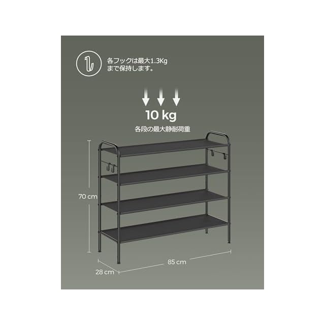 商品名:SONGMICS シューズラック 省スペース おしゃれ 4段 靴 スリム 高さ調節可能な棚 布製 サイドフック付き 玄関 廊下 幅85cm 靴箱 玄関 靴ラック ブラック LMR149B01