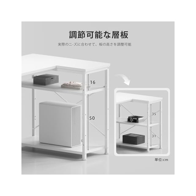 【スマート収納でスッキリ整理】 ・側面の厚手収納ポケットで文房具や書類を収納 ・デスク下の調整可能な2段棚でPC本体やプリンターを配置 ・ヘッドフォンフック付きでコード絡まり防止