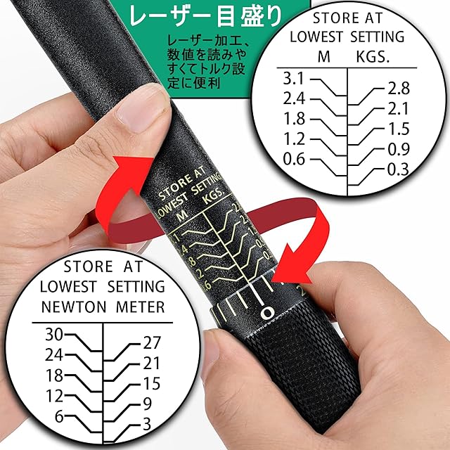 レーザー目盛り:数値を読みやすくてトルク設定に便利。ローレットグリップ:握り心地が良くて、使いやすいです、滑り止めになり、握り具合を良くします。