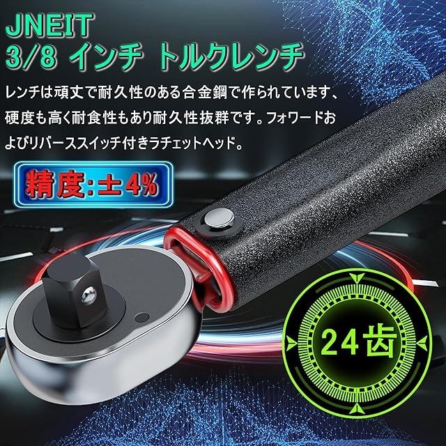 <b>【合金鋼ラチェットヘッド】</b><br> ・レンチは頑丈で耐久性のある合金鋼で作られています、硬度も高く耐食性もあり耐久性抜群です。<br><br> <b>【回転切替レバー】</b><br> ・右回転、左回転を簡単に切替できる。<br> <br> <b>【レーザー目盛り】</b><br> ・数値を読みやすくてトルク設定に便利。<br> <br> <b>【ローレットグリップ】</b><br> ・握り心地が良くて、使いやすいです、滑り止めになり、握り具合を良くします。<br><br> <b>【測定精度】</b><br> ・精度は±4%以内でDIN-ISO-6789を満たします。<br> <br> <b>【「カチッ」という音】</b><br> ・トルク設定値に達すると軽いショック「カチッ」という音で知らせてくれます。<br><br> <b>【ロックリング】</b><br> ・グリップを回すことで測定値を変更でき、グリップエンドで設定値をロックできます。<br> <br> <b>【商品仕様】</b><br> ・全長:28.5 cm<br> ・重量:0.9 kg<br> ・ギア数:24山<br> ・最小目盛:0.1 Nm<br> ・差込角:9.5 mm<br> ・測定範囲:3 Nm 〜 30 Nm<br> ・測定誤差:±4%<br><br> <b>【付属品】</b><br> ・3/8インチとるくレンチ<br> ・11点ヘックスビット:H2, H2.5, H3, H4, H5, H6, H8; 3/32, 7/64, 5/32, 3/16<br> ・9点トルクスビット:T6, T8, T10, T15, T20, T25, T30, T40, AD<br> ・7,5 cmエクステンションバー<br> ・変換ジョイント