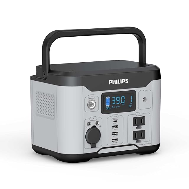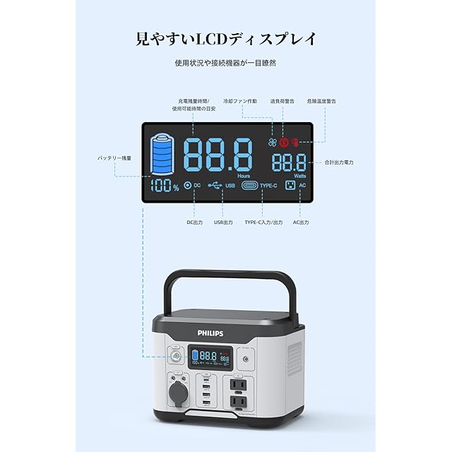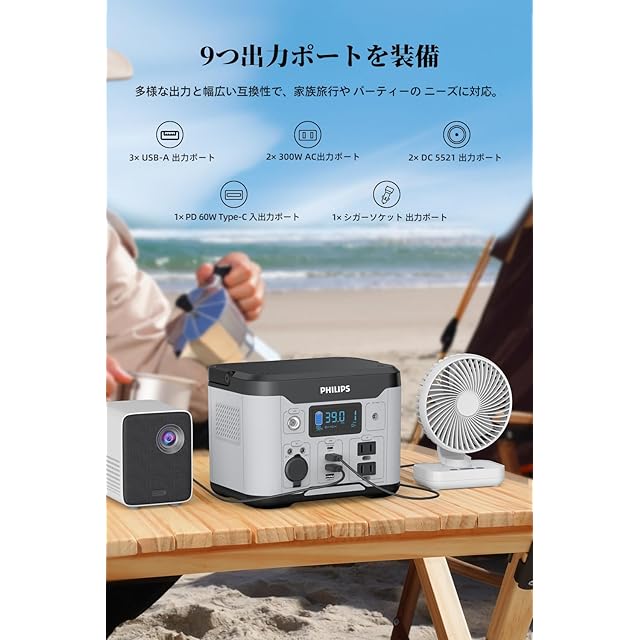 商品名:Philips 300W/296Wh(14. 8V換算) ポータブル電源 大容量 ポータブルバッテリー バックアップ電源 9台同時充電 パススルー機能 純正弦波 AC(瞬間600W)/DC/PD 60W USB-C/シガーソケット出力 5つ充電方法 ledライト付 非常用電源 ソーラー充電 PSE認証済 DLP8091C