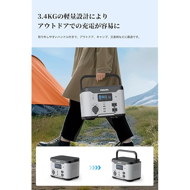 【PHILIPS品質!高品質のリチウム三元電池使用】 リチウム三元電池は、高エネルギー密度、軽量、高定電流比、良好な耐低温性などの利点があります。 リン酸鉄リチウム電池と比べ、充電効率が高く、低温性能に優れ、-20℃でも容量の約70%を放出でき、放電開始速度が速くなっています。 そして、リチウム三元電池を使用したポータブル電源は自然放電率が低く、寿命も長くなります。