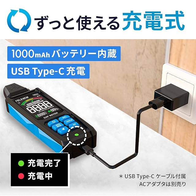 ✅【ずっと使える充電式】1000mAhバッテリー内蔵で電池を交換することなくずっと使い続けることができます。USB Type-C充電で汎用性があり使いやすい電磁波計となっております。