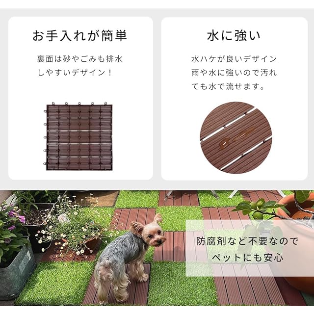 隙間から水が排水されるので、雨水がたまりにくく水ハケが良い。 また、雨や水にも強いので汚れても洗い流せてお掃除もラクラク。