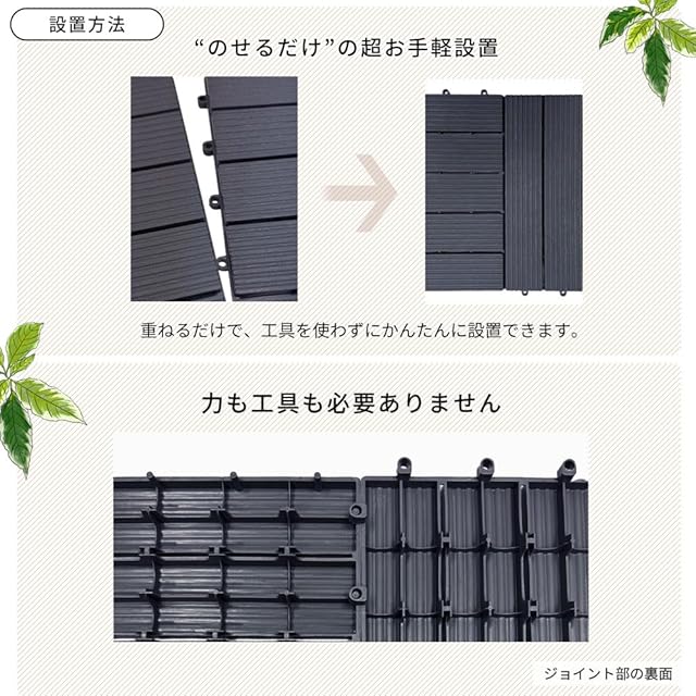 プロテックのジョイントパネルシリーズとジョイント形状が同じの為自由に組み合わせて設置できます。 プロテックのアカシアウッドパネル・人工芝と互換性があります。 ※他社製品との互換性はございません。 本製品は重量物のため、お客様都合での返品はお受けいたしかねますことをご了承願います。