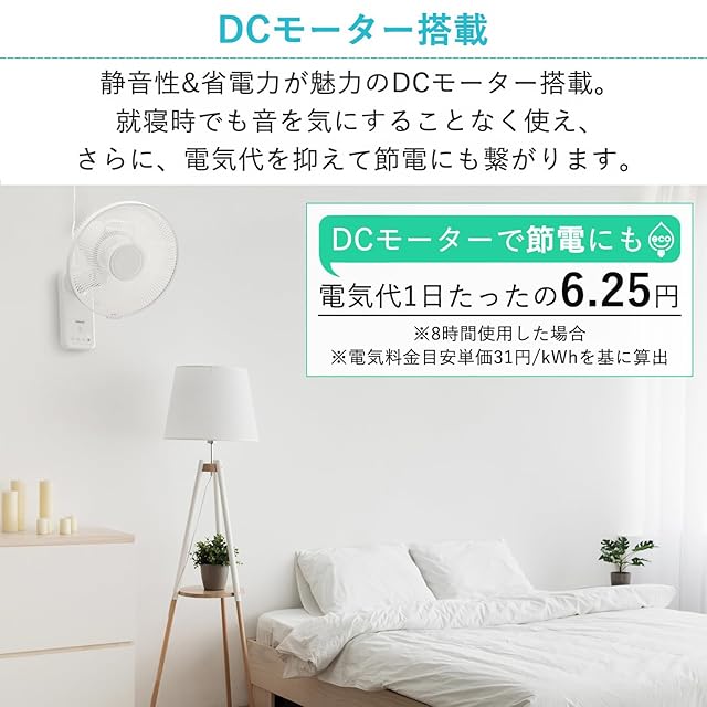 【壁掛け扇風機】壁面に設置して、限られたスペースの有効活用ができる壁掛け扇風機。消費電力が少なく節電に繋がるDCモーター搭載モデル。置き場所に困りがちな脱衣所・洗面所などで活躍します。リモコンが付属しているので、高い場所に設置しても操作は簡単です。