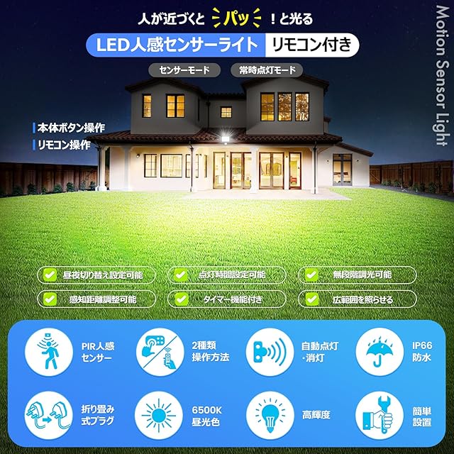 商品タイプ:超高輝度80W人感センサーライト・昼光色・リモコン操作&センサー部ボタン操作・常時点灯機能・無段階調光・タイマー機能
