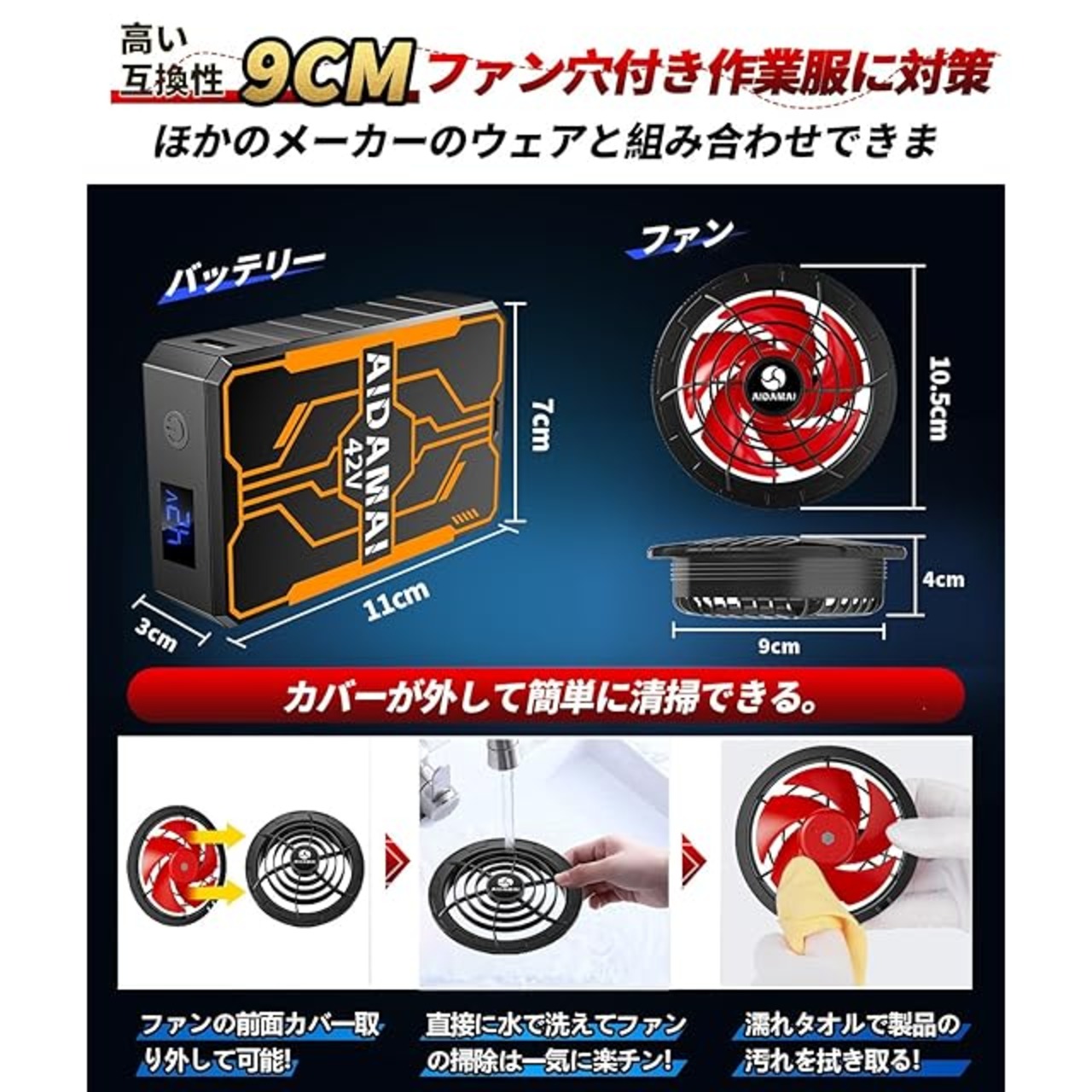 【2025最新作・42V暴風ファンバッテリー セット】日本の職人精神!毎年自己突破を続けている、日本の職人による丁寧な開発企画、42Vの超強力風力が登場!最高風力は昨年の32Vから42Vに上昇し、風力も従来の1.7倍、最大風速は216L/秒に達し、体を急速に冷やすことができ、最も快適な状態に達することができます。着用後、服内の急速な空気の流れにより、皮膚の汗が急速に蒸発し、体の表面温度を急速に低下させ、屋外作業者には最適な商品です。