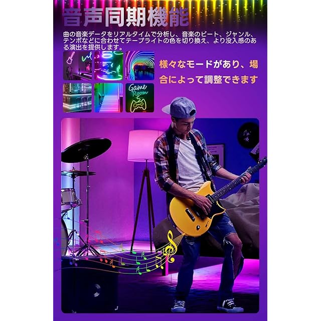 【音声同期&タイマー機能】曲の音楽データをリアルタイムで分析し、音楽のビート、ジャンル、テンポなどに合わせてテープライトの色を切り換え、より没入感のある演出を提供します。タイマー機能があり、時間切れになると、自動的に0N/OFFします。