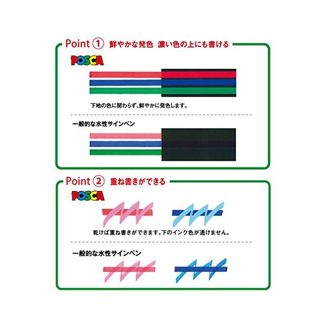 ポスターカラーのようなあざやかな発色 不透明インクなので、黒や濃色の上でも鮮やかに発色、重ね書きも可能。ペン先の太さやインクの種類も豊富なので、多彩な用途に使うことができます。