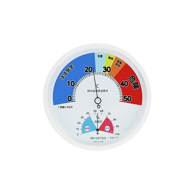 快適空間の目安に、視認性の高いアナログ温湿度計<br> <br> ●ユニバーサルカラー・ユニバーサルフォント採用<br> ●大きな文字なので遠くからでもよく見えます。<br> <br> サイズ:直径30×厚み4.9cm<br> 重量:675g<br> <材質><br> ケース:ABS樹脂<br> フロントレンズ:ガラス<br> 文字盤:アルミ<br> <測定範囲温度><br> 温度0~50℃ 1目盛0.5℃<br> 湿度0~100% 1目盛5%<br> <精度範囲温度><br> 温度0~50℃ ±2℃以内<br> 湿度35~85% ±5℃以内(周囲環境20℃~25℃において)<br>※電池不要<br> ※取付用金具は付属しておりません。<br>