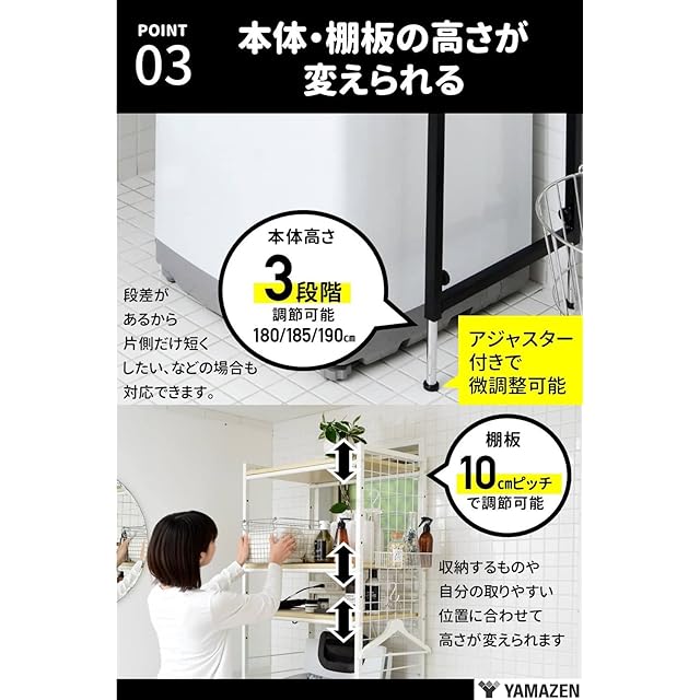 商品名:山善(YAMAZEN) ランドリーラック (2口コンセント付き) 幅65.5-90.5×奥行40.5×高さ180/185/190cm 後から設置できる ミニバスケット・S字フック・ワイヤーネット付き 洗濯機 ラック 組立品 ナチュラル/ホワイト EAL-90(NA/WH)