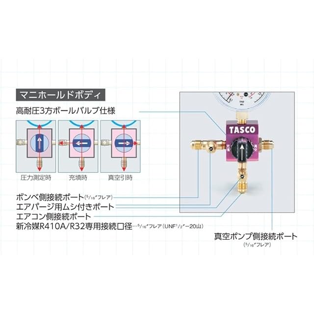 商品名:イチネンTASCO マニホールドゲージ ボールバルブ式 シングルゲージ R32/R410A TA123C