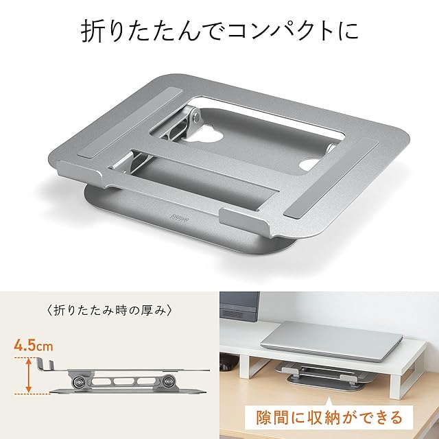 2つのヒンジを搭載し、無段階で自由に角度と高さを調整することができるので、使用環境に合わせて最適な角度で使用できます。また、折りたたんでコンパクトにできるので、省スペースに収納可能です。