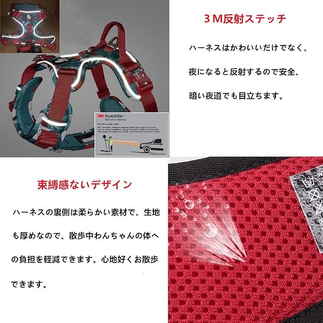 3M反射ステッチ:ハーネスはかわいいだけでなく、夜になると反射するので安全、暗い夜道でも目立ちます。入射した方向に対して集中的に反射するため、ライトに照らされると、遠くからでもよく見えます。