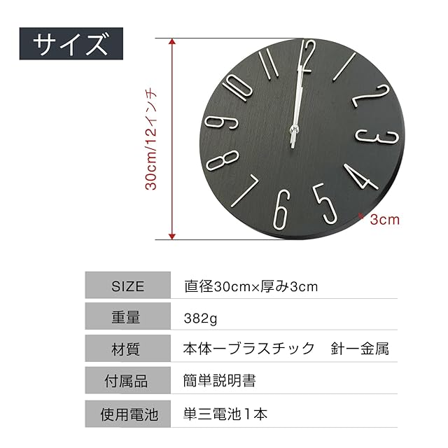 【商品仕様】サイズ:直径約30cm、奥行約3cm、重量約382g。素材:ABS樹脂、アルミ。電池:単3乾電池1本(付属電池なし)、アルカリ電池不可。壁掛け用フックが付いています。
