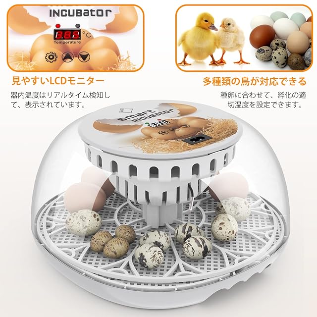 【孵化状況がたやすく確認】透明な観察ウィンドウにより、卵の状態がはっきりとよく見えます。孵化中に全ての卵の発育状況をたやすく確認でき、孵化のプロセスも観察しやすいです。機内温度をリアルタイムでデジタル表示します。今孵化の温度は一目で分かります。【お手入れしやすい分離式】パーツとアタッチメントは水洗いできます。お手入れはお手間かかりません。
