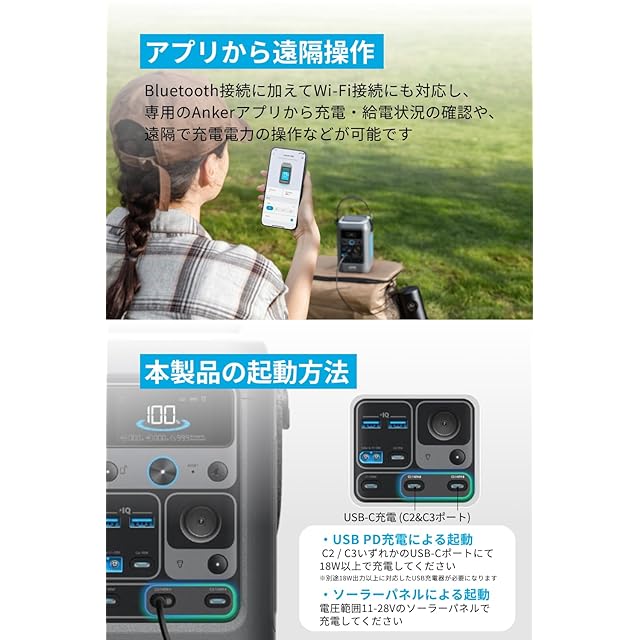 ご注意:本製品は初回利用時に本体充電が必要です。18W以上で出力可能なUSB Power Delivery対応のUSB充電器(別売り)でUSB-Cポートから充電いただくか、ソーラーパネルで充電いただけます。本製品にはUSB充電器が同梱されていないため、ご注意ください。 本製品は11~28Vのソーラーパネルに対応しています。Anker純正のソーラーパネルのご使用をおすすめいたします。また、ソーラーパネルを複数枚接続する際は同じソーラーパネル製品を接続してください。 ソーラーパネルと接続する際、ソーラーパネルの定格電圧がポータブル電源の入力電圧の範囲に収まるようご注意ください。ポータブル電源の入力電圧の上限を超えたソーラーパネルを接続すると故障のおそれがあります。