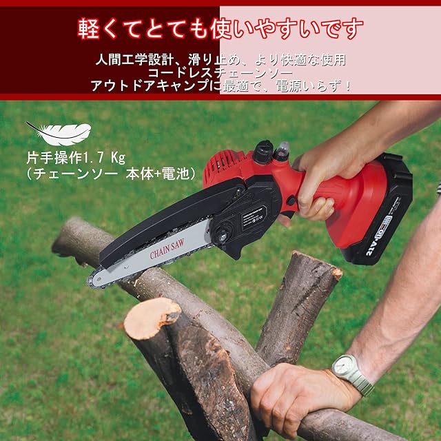案外軽くて素人でも扱いやすい充電式チェーンソーかと思います。<br><br> バッテリーの持ちがよくて。<br><br> 切れ味も申し分なし。<br><br> 使用は快適。<br><br> 気軽に枝をカットできる。<br><br> これから大型ゴミをカットして捨てやすくすることに活躍してくれそうです。 ① 本機が熱くなったり、異常に気づいたときは点検・修理に出してください。 ②通気孔を雑草や刈った草と木のくずなどでふさがないように、常に注意してください。 モータの故障の原因になります。 ③使用前に、保護カバーやその他の部品に損傷がないか十分点検し、正常に作動するか、また所定機能を発揮するか確認してください。異常がある場合は、使用する前に修理を行ってください。 ④ 異常・故障時には、直ちに使用を中止してください。そのまま使用すると発煙・発火、感電、けがに至る恐れがあります。 ⑤本機は木や木製品の切るを目的とした機械です。この目的以外には、使用しないでください。