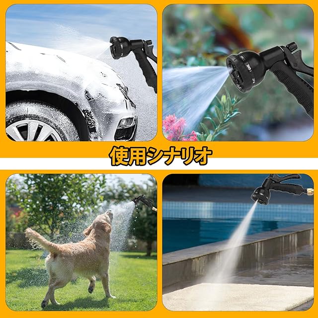 【製品内容】散水ホース本体×1、8種類の機能付き散水ノズル×1、ガーデニング手袋×1組、収納バッグ×1、蛇口アダプター3種、フック×1、日本語取扱説明書×1、シーリング用パーツ入りの小袋×1。付属品が充実しており、さまざまな用途に対応できます