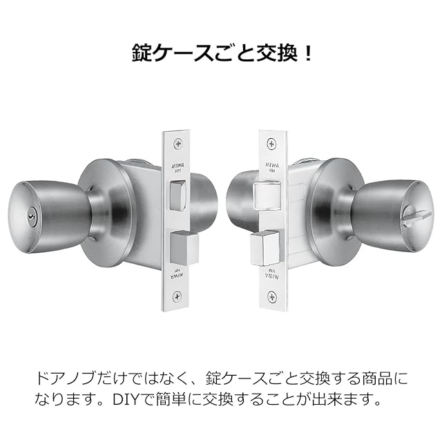 MIWA( 美和ロック )のHM用交換ドアノブは玄関ドアや勝手口、事務所の出入り口など非常に多くの扉に取り付けられています。本商品はドアノブだけでなく、錠ケースを含めて一式交換するものです。キーは3本付属しています。