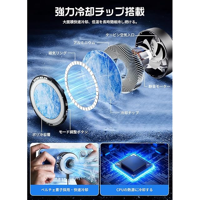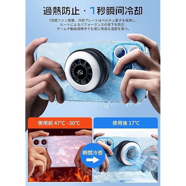 【ペルチェ素子瞬間冷却・凍結可能・抜群な冷却効果】冷却シートとファンを搭載したスマホクーラー、直接にスマホを冷却し、CPUの消費を減らすことができ。冷却ファンが電源接続後に自動的稼働し、スマホの熱暴走対策ができます、ビデオやゲームなどを長時間すると、スマホが熱くなります。超巨大な冷却面積、円形の全方位放熱アルミニウム伝導、温度を氷点下まで下げることができます!冷却効果が良いので、結露する可能性があります。これは自然現象です、ご安心ください。